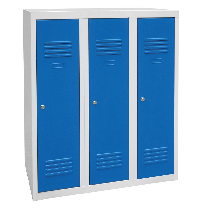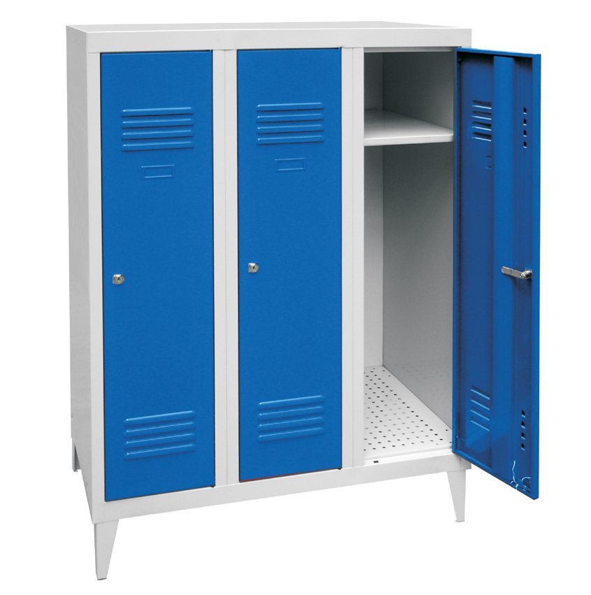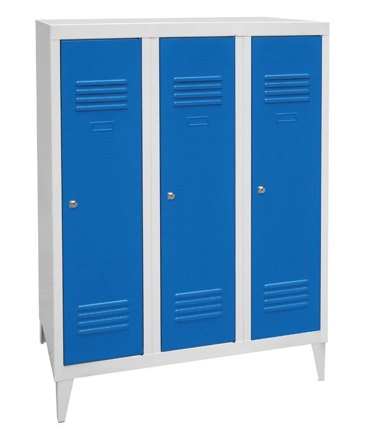 Šatníková skrinka trojdverová zváraná, výška 1200 x šírka 900 x hĺbka 500 mm. Uzamykanie na cylindrický zámok alebo uzáver pro visací zámok, vnútorné vybavenie každého oddelenia polica s tyčou na ramienka a háčik. Na prianie s navarenými nohami - výška skrine s nohami 1350 mm. Farba korpusu RAL 7035 svetlo šedá.