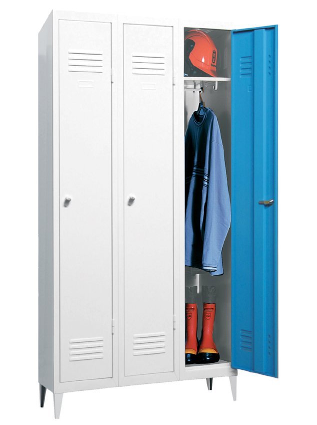 Šatníková skrinka trojdverová zváraná, výška 1800 x šírka 900 x hĺbka 500 mm. Uzamykanie na cylindrický zámok alebo uzáver pro visací zámok, vnútorné vybavenie každého oddelenia polica s tyčou na ramienka a háčik. Na prianie s navarenými nohami - výška skrine s nohami 1950 mm. Farba korpusu RAL 7035 svetlo šedá.