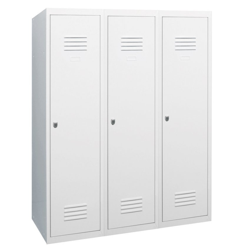 Šatníková skrinka trojdverová zváraná, výška 1200 x šírka 900 x hĺbka 500 mm. Uzamykanie na cylindrický zámok alebo uzáver pro visací zámok, vnútorné vybavenie každého oddelenia polica s tyčou na ramienka a háčik. Na prianie s navarenými nohami - výška skrine s nohami 1350 mm. Farba korpusu RAL 7035 svetlo šedá.