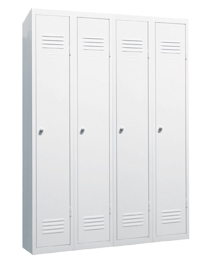 Šatníková skrinka štvordverová zváraná, výška 1500 x šírka 1200 x hĺbka 500 mm. Uzamykanie na cylindrický zámok alebo uzáver pro visací zámok, vnútorné vybavenie každého oddelenia polica s tyčou na ramienka a háčik. Na prianie s navarenými nohami - výška skrine s nohami 1650 mm. Farba korpusu RAL 7035 svetlo šedá.