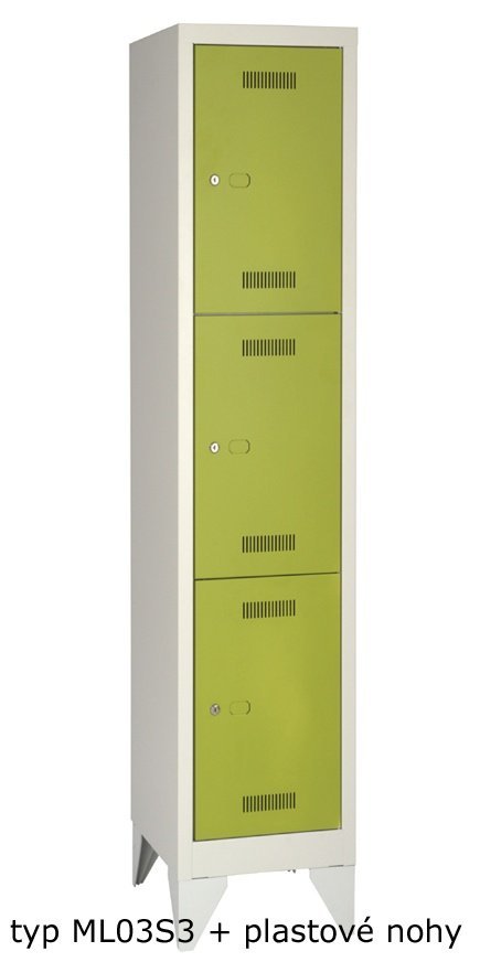 Zváraná šatníková skriňa s dělenými dverami, na soklu alebo na nohách. Šírka oddelenia 400 mm, výška 1700 mm, so soklom 1806 mm, s nohami 1850 mm, s podstavnou lavicou 2100 mm. Lavica je štandarne vybavená rektifikačnými patkami. Zámok je možné zvoliť ako cylindrický, s príplatkom uzáver pre visiaci zámok alebo otočný kódový zámok. Farba korpusu svetlosivá (RAL 7035), farba dverí podľa výberu.