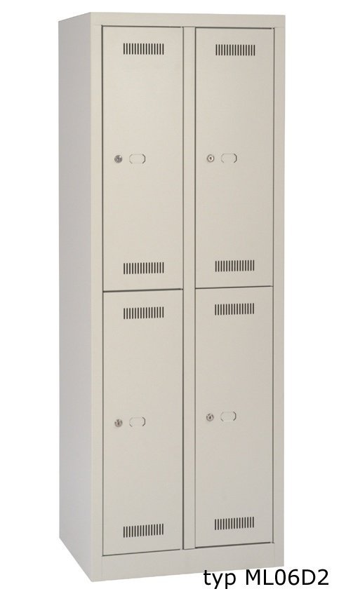 Zváraná šatníková skriňa s dělenými dverami, na soklu alebo na nohách. Šírka oddelenia 400 mm, výška 1700 mm, so soklom 1806 mm, s nohami 1850 mm, s podstavnou lavicou 2100 mm. Lavica je štandarne vybavená rektifikačnými patkami. Zámok je možné zvoliť ako cylindrický, s príplatkom uzáver pre visiaci zámok alebo otočný kódový zámok. Farba korpusu svetlosivá (RAL 7035), farba dverí podľa výberu.