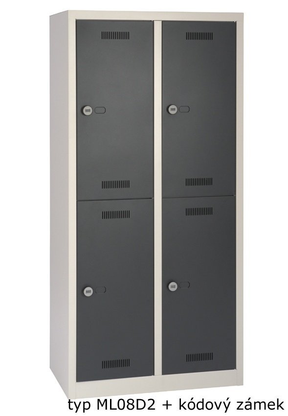 Zváraná šatníková skriňa s dělenými dverami, na soklu alebo na nohách. Šírka oddelenia 400 mm, výška 1700 mm, so soklom 1806 mm, s nohami 1850 mm, s podstavnou lavicou 2100 mm. Lavica je štandarne vybavená rektifikačnými patkami. Zámok je možné zvoliť ako cylindrický, s príplatkom uzáver pre visiaci zámok alebo otočný kódový zámok. Farba korpusu svetlosivá (RAL 7035), farba dverí podľa výberu.