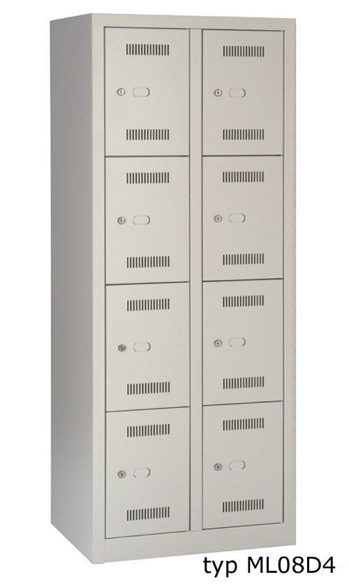 Zváraná šatníková skriňa s dělenými dverami, na soklu alebo na nohách. Šírka oddelenia 400 mm, výška 1700 mm, so soklom 1806 mm, s nohami 1850 mm, s podstavnou lavicou 2100 mm. Lavica je štandarne vybavená rektifikačnými patkami. Zámok je možné zvoliť ako cylindrický, s príplatkom uzáver pre visiaci zámok alebo otočný kódový zámok. Farba korpusu svetlosivá (RAL 7035), farba dverí podľa výberu.
