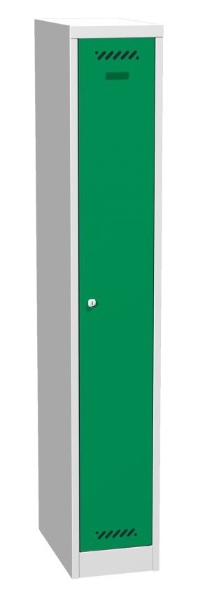 Jednooddielový zváraný šatník s šírkou oddielu 300 mm, výška 1800 mm, hĺbka 500 mm. Uzamykanie cylindrickým zámkom s dvomi kľúčmi alebo otočným zámkom pre visiaci zámok. Farba korpusu svetlosivá, farba dverí svetlosivá, modrá, zelená, červená alebo žltá. V každom oddielu je ohyb zabraňujúci vtlačeniu dverí dovnútra skrine a vypáčenie zámku.