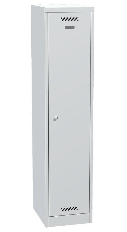 Jednooddielový zváraný šatník s šírkou oddielu 300 mm, výška 1800 mm, hĺbka 500 mm. Uzamykanie cylindrickým zámkom s dvomi kľúčmi alebo otočným zámkom pre visiaci zámok. Farba korpusu svetlosivá, farba dverí svetlosivá, modrá, zelená, červená alebo žltá. V každom oddielu je ohyb zabraňujúci vtlačeniu dverí dovnútra skrine a vypáčenie zámku.