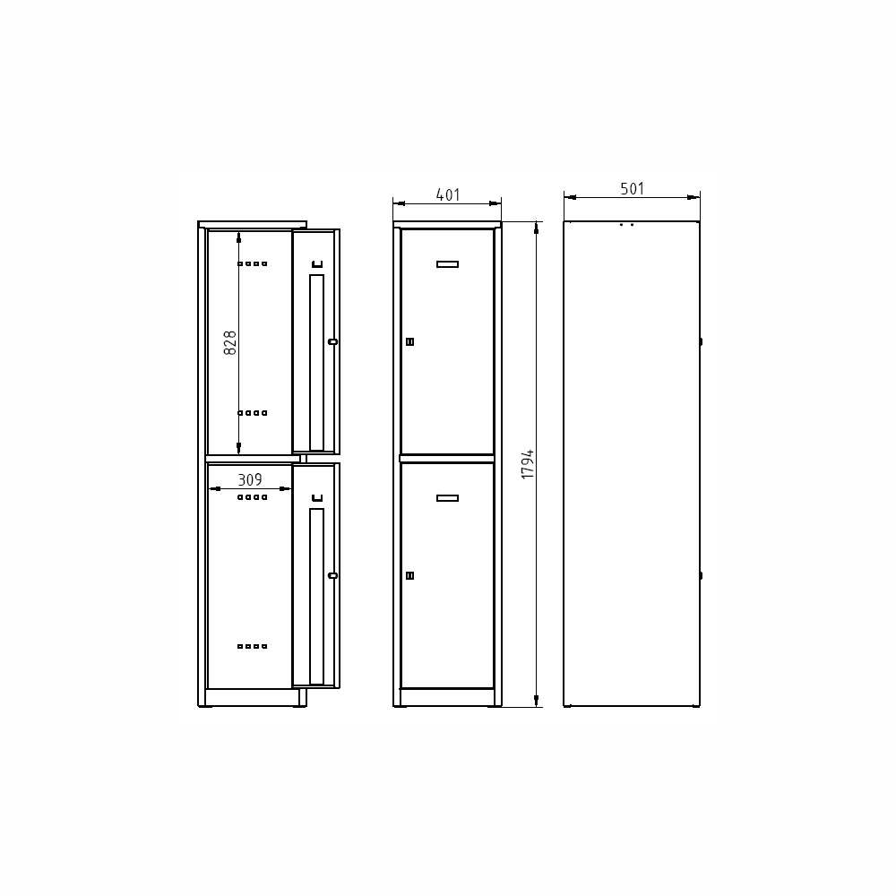 Kovová skriňa s uzamykateľnými boxmi, výška 1800 x šírka 800 x hĺbka 500 mm. Zamykanie na kľúč alebo uzáver pro visací zámok. Farba korpusu RAL 7035 svetlo šedá.