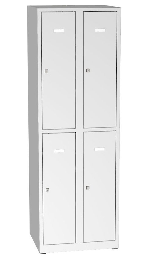 Šatníková skriňa kovová delená, výška 1800 x šírka 600 x hĺbka 500 mm. Zamykanie na kľúč alebo uzáver pro visací zámok. Farba korpusu RAL 7035 svetlo šedá.