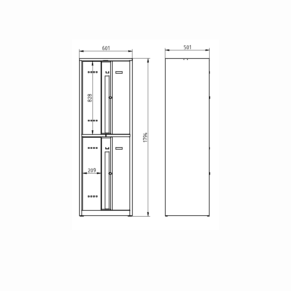 Kovová skriňa s uzamykateľnými boxmi, výška 1800 x šírka 800 x hĺbka 500 mm. Zamykanie na kľúč alebo uzáver pro visací zámok. Farba korpusu RAL 7035 svetlo šedá.