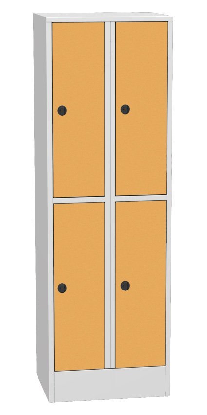 Štvordverová kovová šatníková skrinka delená, šírka 600, výška 1850, hĺbka 493 mm. Kovový korpus vo farbe svetlosivej RAL 7035, dvere HPL lamino v dezénu modrá, svetlozelená alebo svetlooranžová. Cylindrický zámok s dvoma kľúčmi alebo uzáver pre visací zámok. Vnútorná výbava každého oddelenia - tyč s tromi posuvnými háčikmi.