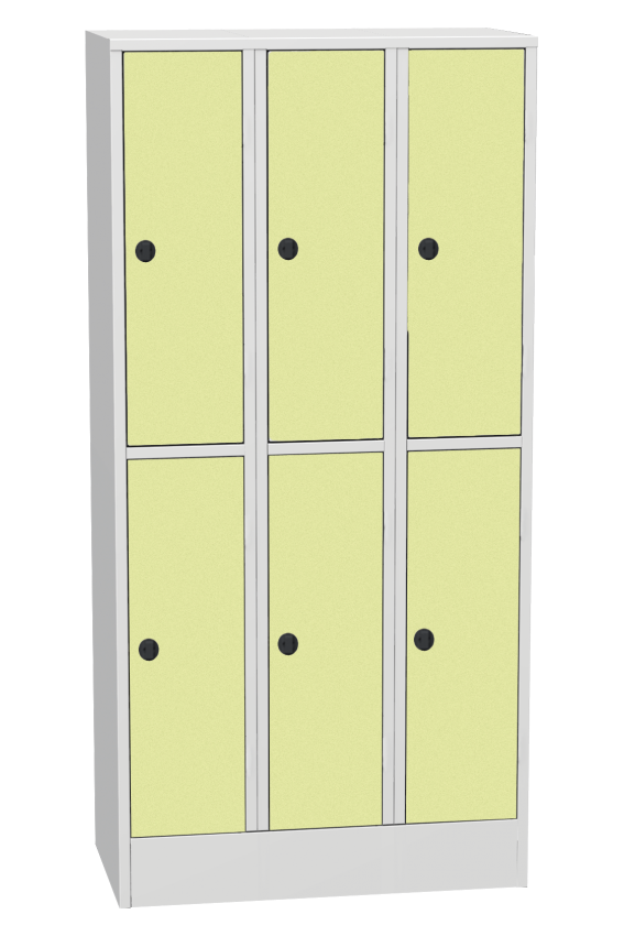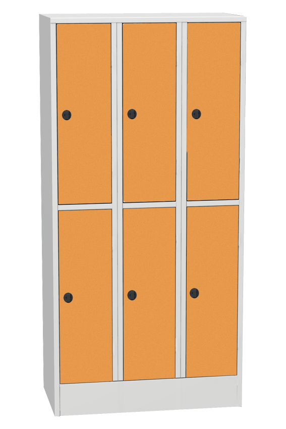 Šesťdverová kovová šatníková skrinka delená, šírka 900, výška 1850, hĺbka 493 mm. Kovový korpus vo farbe svetlosivej RAL 7035, dvere HPL lamino v dezénu modrá, svetlozelená alebo svetlooranžová. Cylindrický zámok s dvoma kľúčmi alebo uzáver pre visací zámok. Vnútorná výbava každého oddelenia - tyč s tromi posuvnými háčikmi.