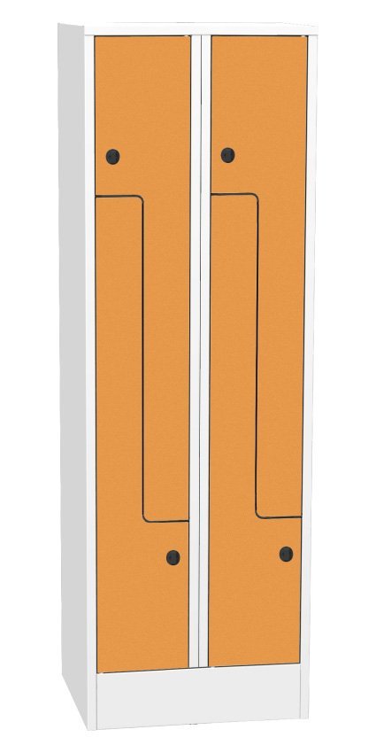 Dvojdverová kovová šatníková skrinka delená, šírka 400, výška 1850, hĺbka 493 mm. Kovový korpus vo farbe svetlosivej RAL 7035, dvere HPL lamino v dezénu modrá, svetlozelená alebo svetlooranžová. Cylindrický zámok s dvoma kľúčmi alebo uzáver pre visací zámok.