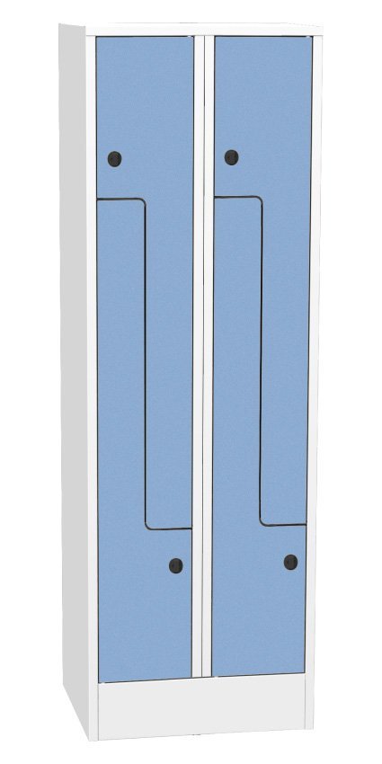 Štvordverová kovová šatníková skrinka delená, šírka 600, výška 1850, hĺbka 493 mm. Kovový korpus vo farbe svetlosivej RAL 7035, dvere HPL lamino v dezénu modrá, svetlozelená alebo svetlooranžová. Cylindrický zámok s dvoma kľúčmi alebo uzáver pre visiaci zámok.