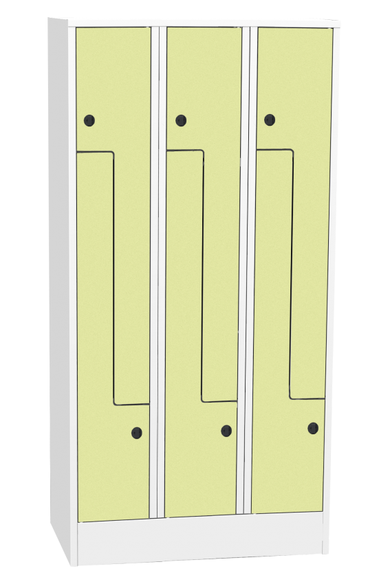 Dvojdverová kovová šatníková skrinka delená, šírka 300, výška 1850, hĺbka 493 mm. Kovový korpus vo farbe svetlosivej RAL 7035, dvere HPL lamino v dezénu modrá, svetlozelená alebo svetlooranžová. Cylindrický zámok s dvoma kľúčmi alebo uzáver pre visací zámok.