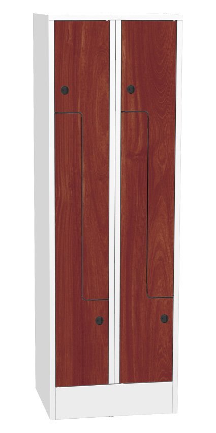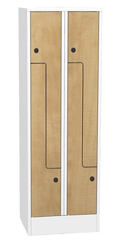 Dvojdverová kovová šatníková skrinka delená, šírka 300, výška 1850, hĺbka 500 mm. Kovový korpus vo farbe svetlosivej RAL 7035, dvere lamino v dezénu buk, breza alebo čerešňa. Cylindrický zámok s dvoma kľúčmi alebo uzáver pre visací zámok.