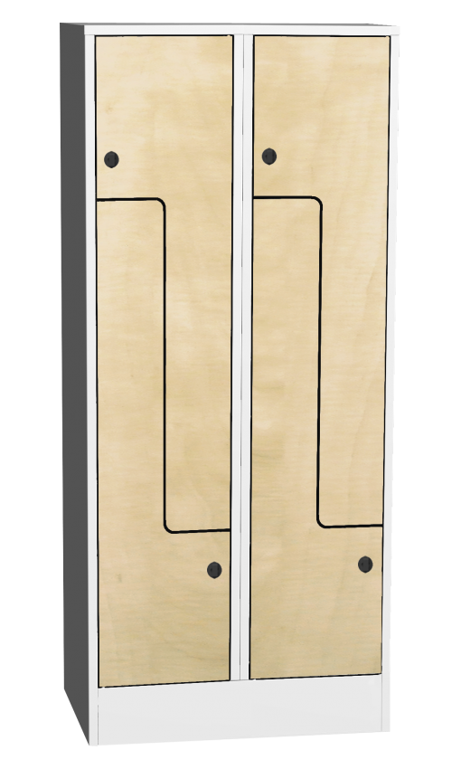 Dvojdverová kovová šatníková skrinka delená, šírka 300, výška 1850, hĺbka 500 mm. Kovový korpus vo farbe svetlosivej RAL 7035, dvere lamino v dezénu buk, breza alebo čerešňa. Cylindrický zámok s dvoma kľúčmi alebo uzáver pre visací zámok.