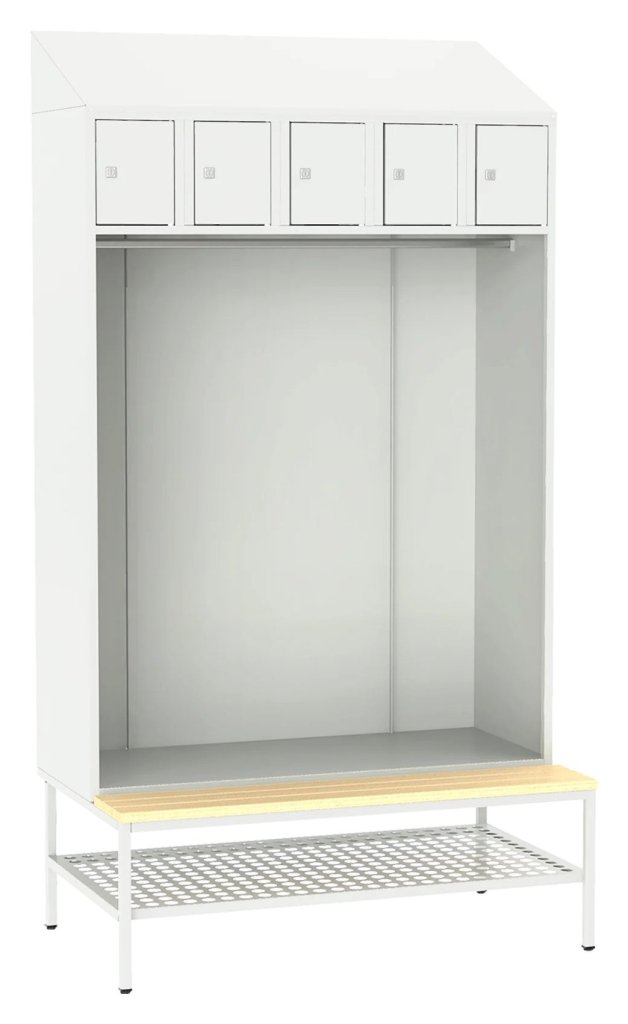 Otvorené šatňové zostavy sú praktickým riešením spoločenských miestností či šatní, kde nie je nutné oblečenie uzatvárať do samostatných skríň. 5x úložný box na drobné osobné predmety, šatníková tyč na ramienka, drevená lavička, dierovaný odkladací rošt na obuv. 16 farebných odtieňov na výber v cene bez príplatku.