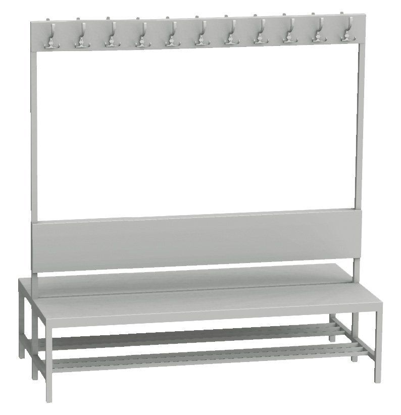Šatňová lavica s operadlom a vešiakom 1000 mm dvojstranná. Výška 1800, šírka 1000, hĺbka 830 mm, 16 vešiakov (8 x 2). Farba svetlosivá RAL 7035.