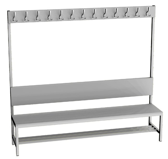 Šatňová lavica s operadlom a vešiakom 2000 mm dvojstranná. Výška 1800, šírka 2000, hĺbka 830 mm, 26 vešiakov (13 x 2). Farba svetlosivá RAL 7035.
