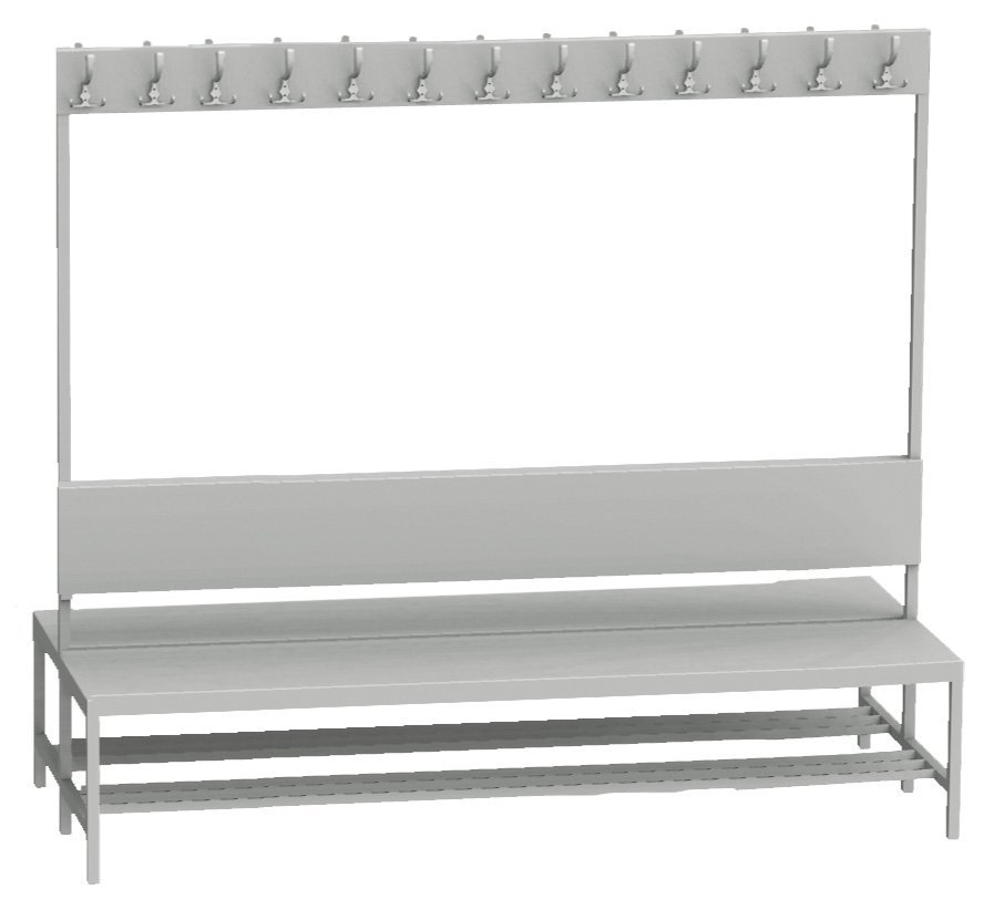Šatňová lavica s operadlom a vešiakom 1500 mm dvojstranná. Výška 1800, šírka 1500, hĺbka 830 mm, 22 vešiakov (11 x 2). Farba svetlosivá RAL 7035.