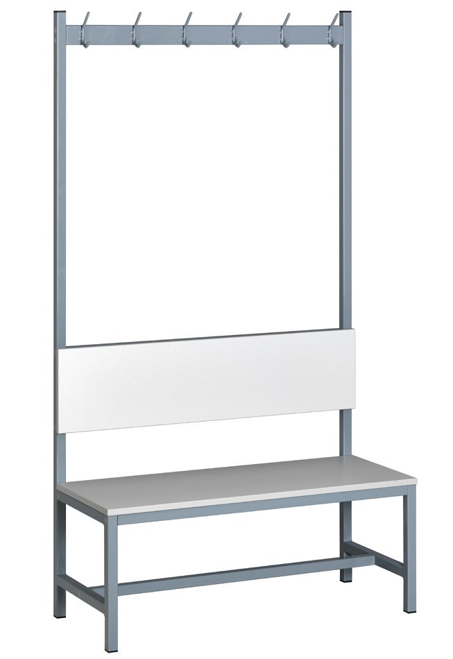Šatňová lavica s operadlom a vešiakom, šírka 1000 x výška 1800 x hĺbka 300 mm, hmotnosť 34 kg.