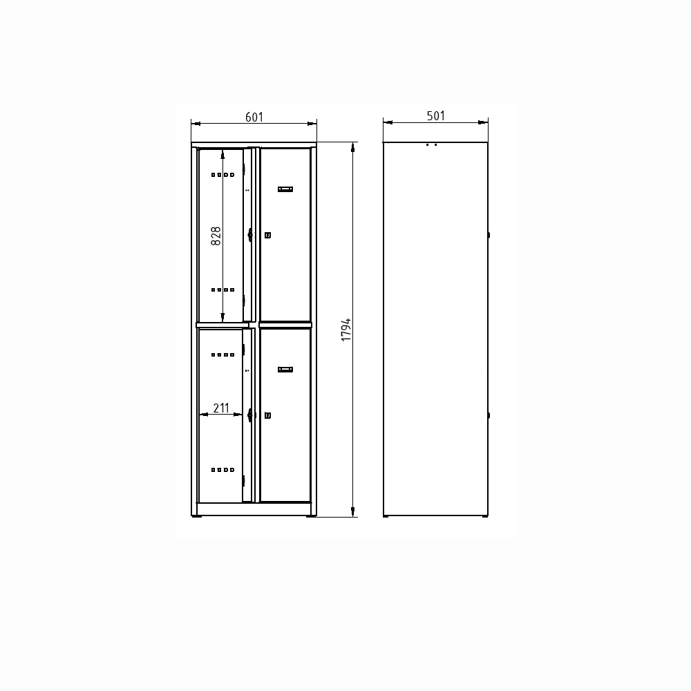 Šatníková skrinka kovová s lamino dverami v dezénu buk. Výška 1800 x šírka 600 x hĺbka 500 mm, 2 oddelenia. Zamykanie na kľúč alebo uzáver pre visací zámok. Dodávané na soklu alebo na nohách (v tomto prípade sa výška skrine zvýši o 150 mm). Farba korpusu svetlosivá RAL 7035.