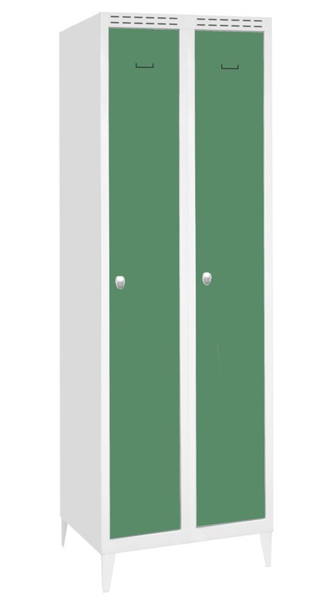 Dvojdverová šatníková skrinka zváraná s dvojplášťovými dverami pre väčšiu bezpečnosť, výška 1800 x šírka 600 x hĺbka 500 mm. Uzamykanie na cylindrický zámok alebo uzáver pro visací zámok, vnútorné vybavenie každého oddelenia polica s tyčou na ramienka a háčik. Na prianie s navarenými nohami - výška skrine s nohami 1950 mm. Farba korpusu RAL 7035 svetlo šedá.