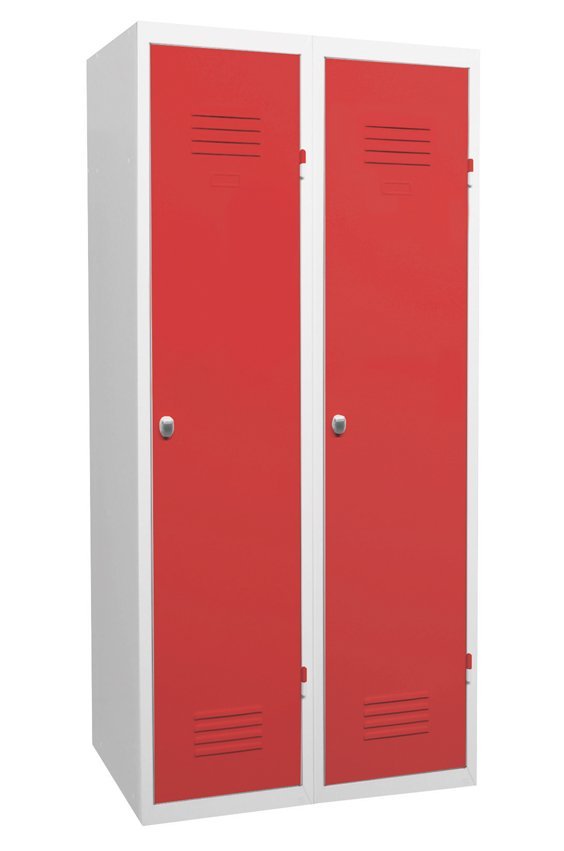 Dvojdverová kovová šatňová skriňa na podstavci. Šírka 800, výška 1800, hĺbka 500 mm, cylindrický zámok alebo uzáver pre visací zámok. Zvislá medzistena pre oddelenie čistých a špinavých odevov. Farba korpusu RAL 7035, svetlosivá.