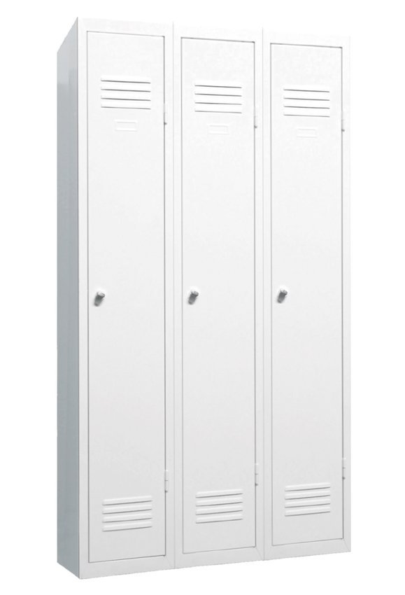 Trojdverová kovová šatňová skriňa na nožičkách. Šírka 900, výška 1950, hĺbka 500 mm, uzáver alebo zámok. Farba korpusu RAL 7035, svetlosivá.