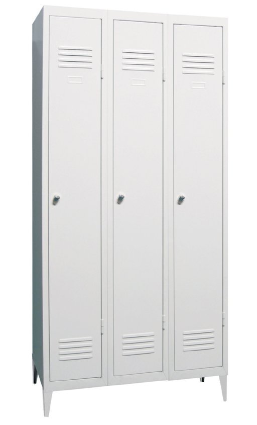 Trojdverová kovová šatňová skriňa na nožičkách. Šírka 900, výška 1950, hĺbka 500 mm, uzáver alebo zámok. Farba korpusu RAL 7035, svetlosivá.