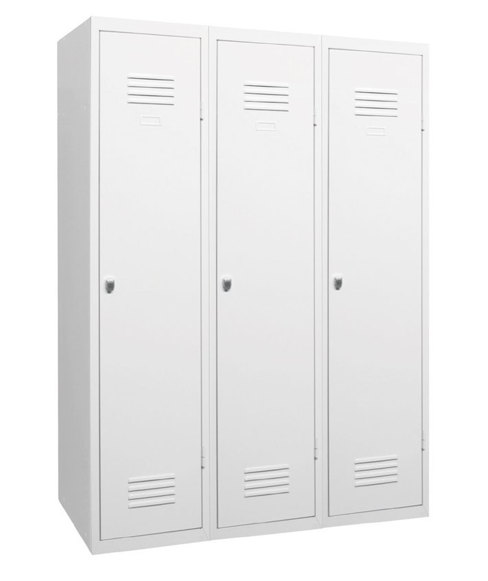 Trojdverová kovová šatňová skriňa na podstavci. Šírka 900, výška 1800, hĺbka 500 mm, cylindrický zámok alebo uzáver pre visací zámok. Farba korpusu RAL 7035, svetlosivá.