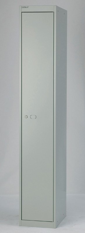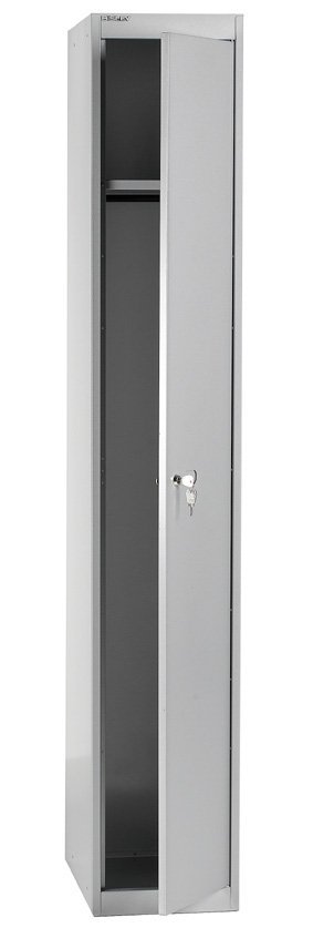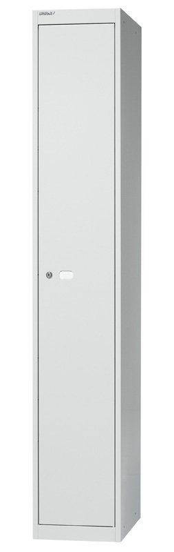 Jednodverová kovová šatňová skriňa. Šírka 305, výška 1802, hĺbka 457 mm. Uzamykanie cylindrickým zámkom s možnosťou náhrady uzáverom pre visiaci zámok alebo kódovým zámkom.
