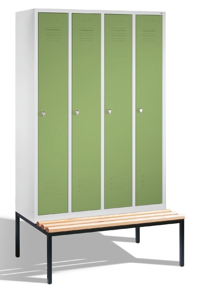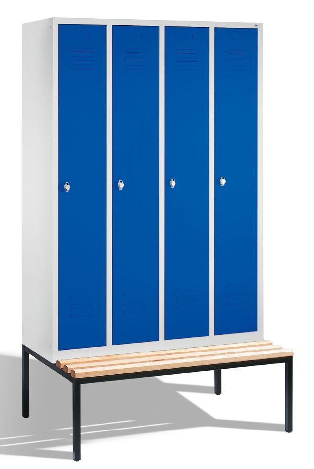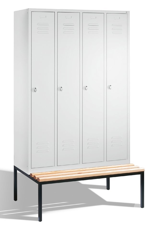 Štvordverová kovová šatníková skrinka (polená) na lavičke - výška 2090, šírka 610, hĺbka 815 mm.