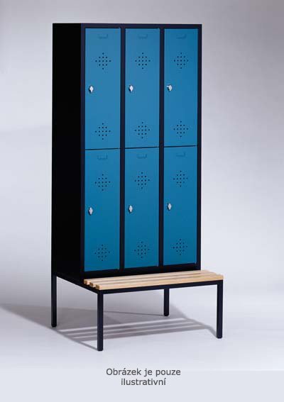 Osemdverová kovová šatňová skrinka (polená) na lavičke šírka 1190, výška 2090, hĺbka 500/815 mm. celý popis a parametre