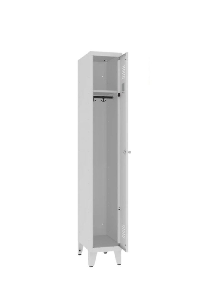 Jednodverová šatníková skrinka na nohách ,so zváranou konštrukciou a moderným dizajnom ventilačného systému. Výška 1940 x šírka 300 x hĺbka 500 mm. Štandardné vybavenie skrinky: tyč s háčikmi, polica nad tyčou, samolepiaci štítok na meno. 16 farebných odtieňov. Rôzne druhy zamykanie.