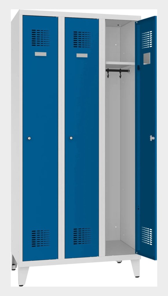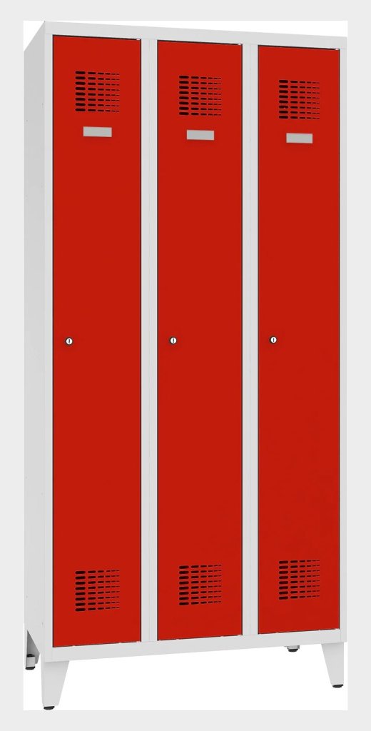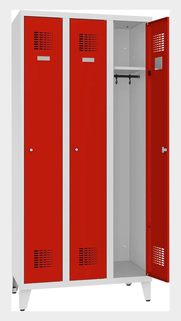 Trojdverová šatníková skrinka na nohách, zváraná s moderným dizajnom ventilačného systému. Výška 1940 x šírka 900 x hĺbka 500 mm. Vybavenie oddelenia: tyč s dvoma háčikmi, háčik na uterák, police nad tyčou, zrkadlo, samolepiaci štítok na meno. 16 farebných odtieňov. Rôzne druhy zamykania.