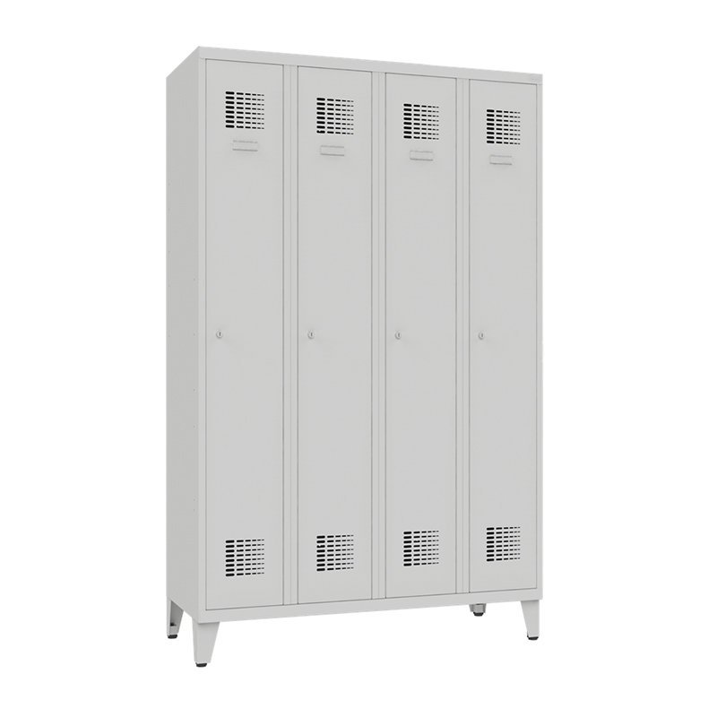 Štvordverová šatníková skrinka na nohách so zváranou konštrukciou a moderným dizajnom ventilačného systému. Výška 1940 x šírka 1200 x hĺbka 500 mm. Štandardné vybavenie skrinky: tyč s dvoma háčikmi, háčik na uterák, zrkadlo, polica nad tyčou, samolepiaci štítok na meno. Cylindrický zámok alebo uzáver na visiaci zámok.