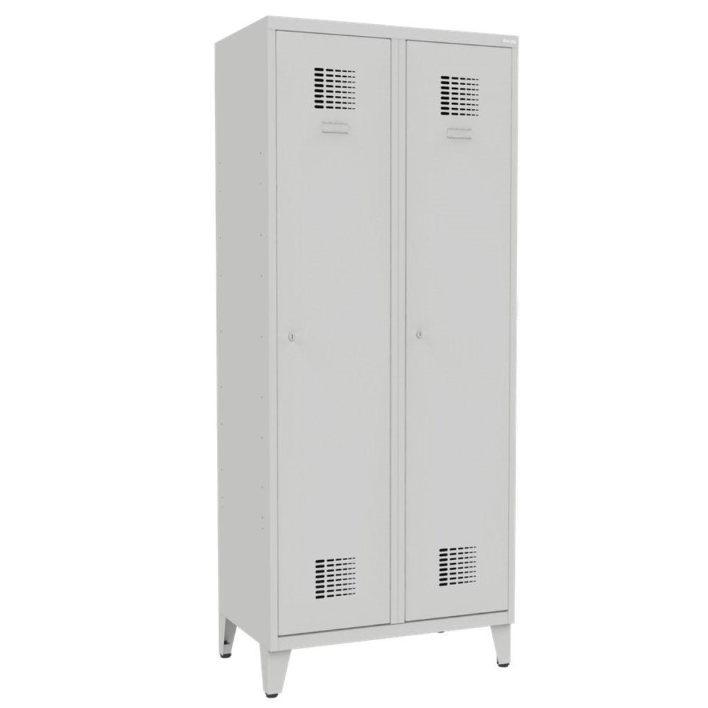 Dvojdverová šatníková skrinka na nohách so zváranou konštrukciou a moderným dizajnom ventilačného systému. Výška 1940 x šírka 800 x hĺbka 500 mm. Štandardné vybavenie skrinky: vnútorná prepážka pre oddelenie čistého a špinavého prádla, tyč s dvoma háčikmi, háčik na uterák, zrkadlo, polica nad tyčou, samolepiaci štítok na meno. Cylindrický zámok alebo uzáver na visiaci zámok.