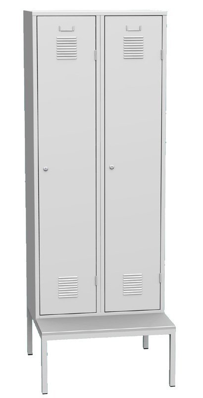 Dvojdverová kovová šatňová skrinka s lavicou šírka 800, výška 2085, hĺbka 810 mm. Farba korpusu RAL 7035 svetlosivá.