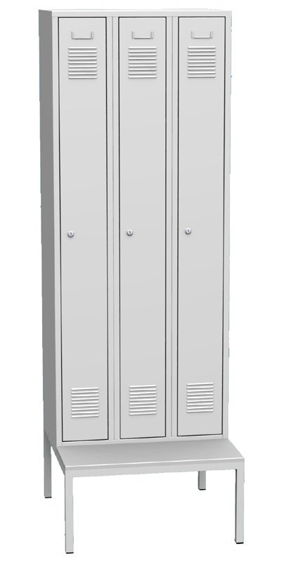 Trojdverová kovová šatňová skrinka s lavicou. Šírka 750, výška 2085, hĺbka 810 mm. Farba korpusu RAL 7035, svetlosivá.