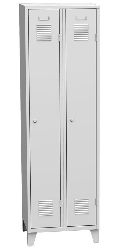 Dvojdverová kovová šatňová skrinka na nohách. Šírka 500, výška 1850, hĺbka 500 mm. Farba korpusu RAL 7035 svetlosivá.