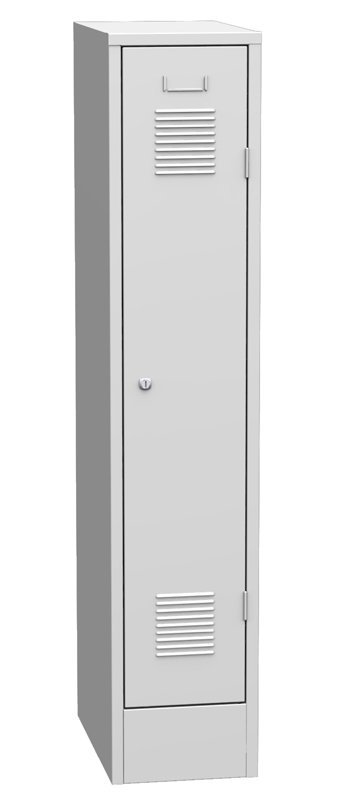 Jednodverová kovová šatňová skrinka na podstavci. Šírka 300, výška 1850, hĺbka 500 mm. Dvere sú štandardne vybavené výstuhou pre zvýšenie odolnosti, vetracími žalúziami pre účinné odvetranie a prelisom s papierovou menovkou. Dvere sú zavesené na vonkajších pántoch, na želanie zákazníka je možné zavesenie aj na vnútorné čapy. Za príplatok je možné dvere vybaviť inými typmi vetracích otvorov pre dodanie aktraktivnějšího vzhľadu. Pre zvýšenie bezpečnosti predĺžiť výstuhu cez celú dĺžku dverí, alebo dvere vymeniť za dvojplášťové. Farba korpusu RAL 7035, svetlosivá.