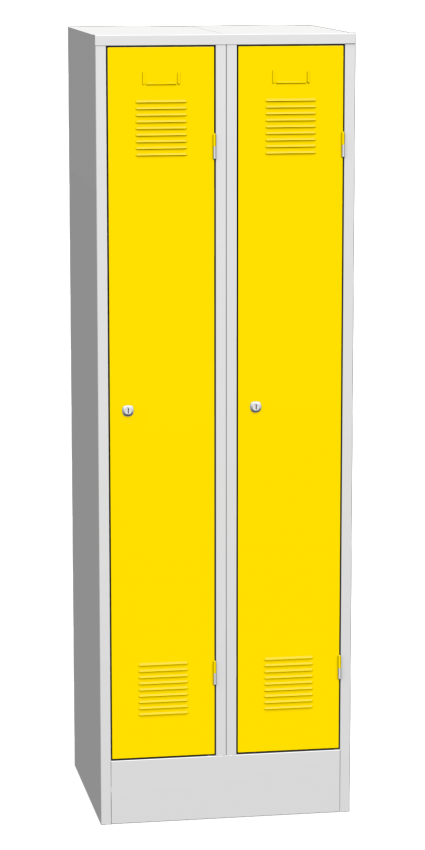 Dvojdverová kovová šatňová skrinka na podstavci, šírka 300, výška 1850, hĺbka 500 mm, vnútorná medzistena pre oddelenie čistých a špinavých odevov. Dvere sú štandardne vybavené výstuhou pre zvýšenie odolnosti, vetracími žalúziami pre účinné odvetranie a prelisom s papierovou menovkou. Dvere sú zavesené na vonkajších pántoch, na želanie zákazníka je možné zavesenie aj na vnútorné čapy. Za príplatok je možné dvere vybaviť inými typmi vetracích otvorov pre dodanie aktraktivnějšího vzhľadu. Pre zvýšenie bezpečnosti predĺžiť výstuhu cez celú dĺžku dverí, alebo dvere vymeniť za dvojplášťové. Farba korpusu RAL 7035 svetlosivá.
