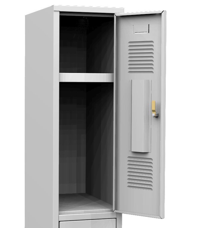 Dvojdverová kovová šatňová skriňa delená 1/2. Šírka 300, výška 1850, hĺbka 500 mm, v hornej časti každého oddelenia je tyč s tromi plastovými posuvnými háčikmi. Farba korpusu RAL 7035, svetlosivá.