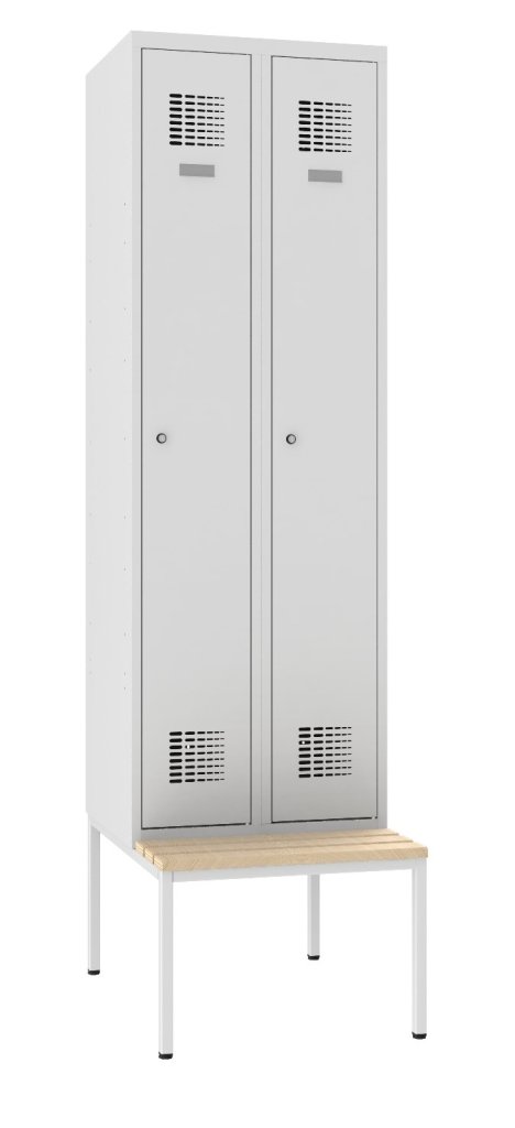Dvojdverová šatníková skrinka s lavicou, zváraná s moderným dizajnom ventilačného systému. Výška 2190 x šírka 600 x hĺbka 500 mm. Cylindrický zámok. Vybavenie oboch oddelení: tyč s dvoma háčikmi, háčik na uterák, polica nad tyčou, zrkadlo, samolepiaci štítok na meno.