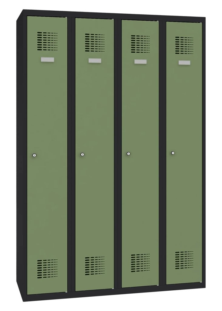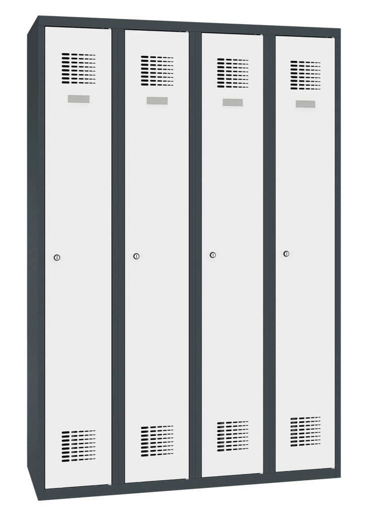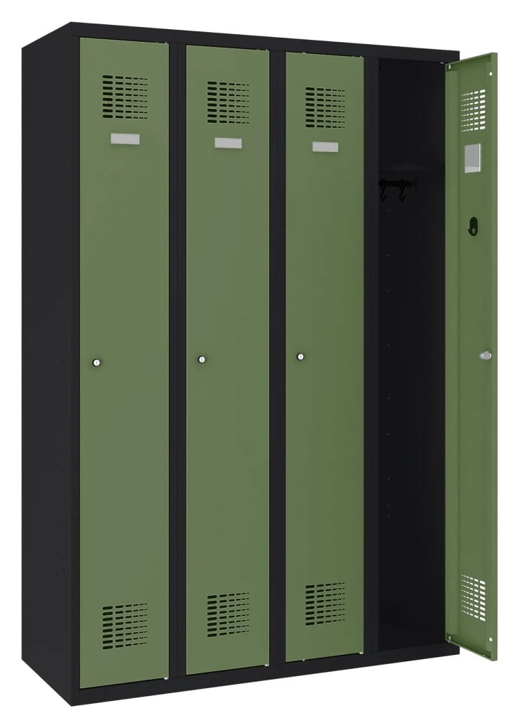 Štvordverová šatníková skrinka so zváranou konštrukciou a moderným dizajnom ventilačného systému. Výška 1800 x šírka 1200 x hĺbka 500 mm. Štandardné vybavenie skrinky: tyč s dvoma háčikmi, háčik na uterák, zrkadlo, polica nad tyčou, samolepiaci štítok na meno. Cylindrický zámok alebo uzáver na visiaci zámok.