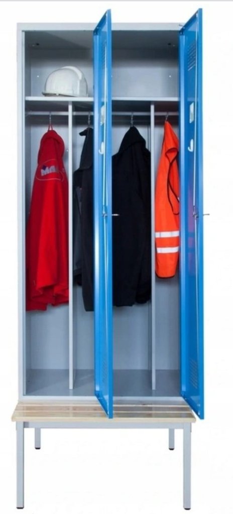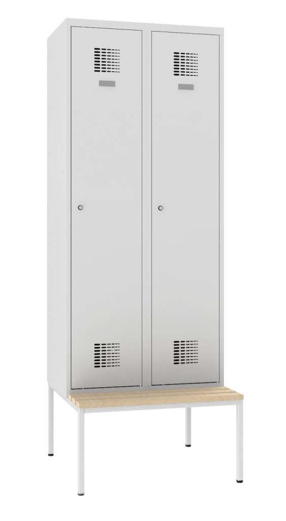 Dvojdverová šatníková skrinka s lavicou a moderným dizajnom ventilačného systému. Výška 2190 x šírka 800 x hĺbka 500 mm. Štandardné vybavenie skrinky: vnútorná prepážka pre oddelenie čistého a špinavého prádla, tyč s dvoma háčikmi, háčik na uterák, zrkadlo, polica nad tyčou, samolepiaci štítok na meno. Cylindrický zámok alebo uzáver na visiaci zámok.