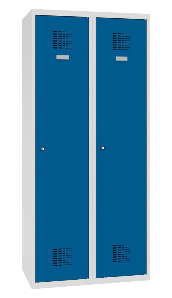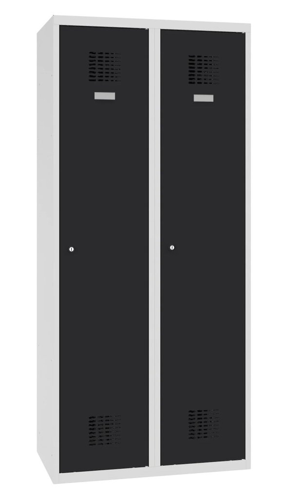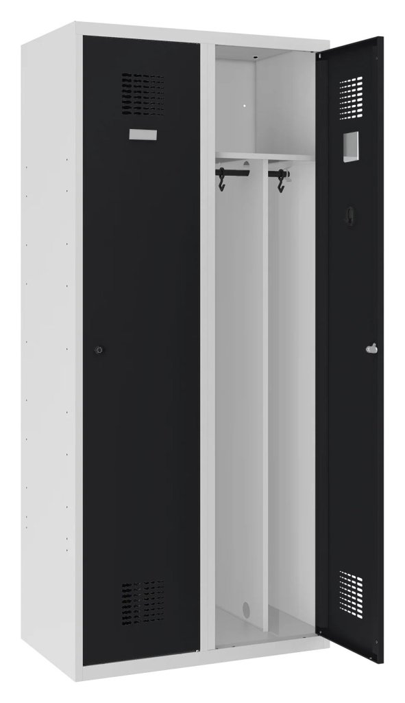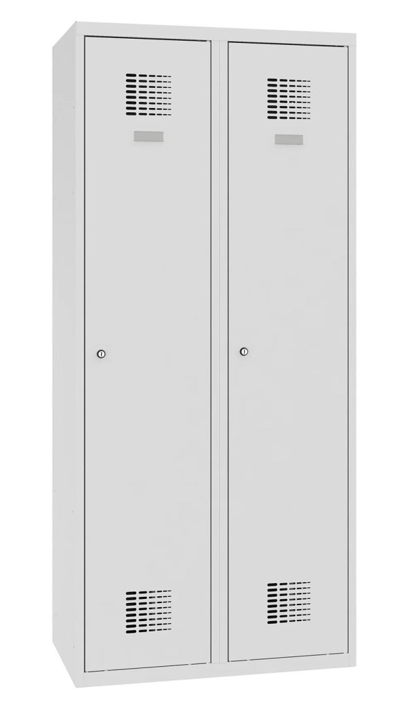 Dvojdverová šatníková skrinka so zváranou konštrukciou a moderným dizajnom ventilačného systému. Výška 1800 x šírka 800 x hĺbka 500 mm. Štandardné vybavenie skrinky: vnútorná prepážka pre oddelenie čistého a špinavého prádla, tyč s dvoma háčikmi, háčik na uterák, zrkadlo, polica nad tyčou, samolepiaci štítok na meno. Cylindrický zámok alebo uzáver na visiaci zámok.