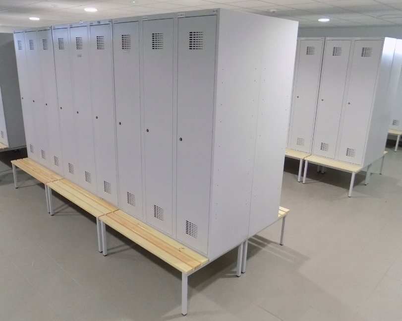 Trojdverová šatníková skrinka s lavicou a moderným dizajnom ventilačného systému. Výška 2190 x šírka 1200 x hĺbka 500 mm. Štandardné vybavenie skrinky: vnútorná prepážka pre oddelenie čistého a špinavého prádla, tyč s dvoma háčikmi, háčik na uterák, zrkadlo, polica nad tyčou, samolepiaci štítok na meno. Cylindrický zámok alebo uzáver na visiaci zámok.