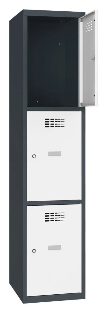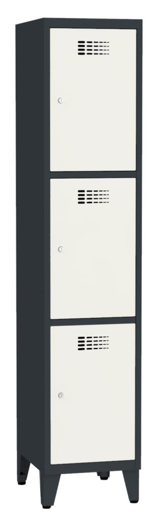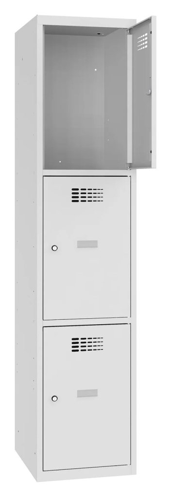 Trojdverová šatníková skrinka so zváranou konštrukciou a moderným dizajnom ventilačného systému. Výška 1800 x šírka 400 x hĺbka 500 mm. Na dverách samolepiaci štítok na meno. 16 farebných odtieňov na výber. Cylindrický zámok alebo uzáver pre visiaci zámok.